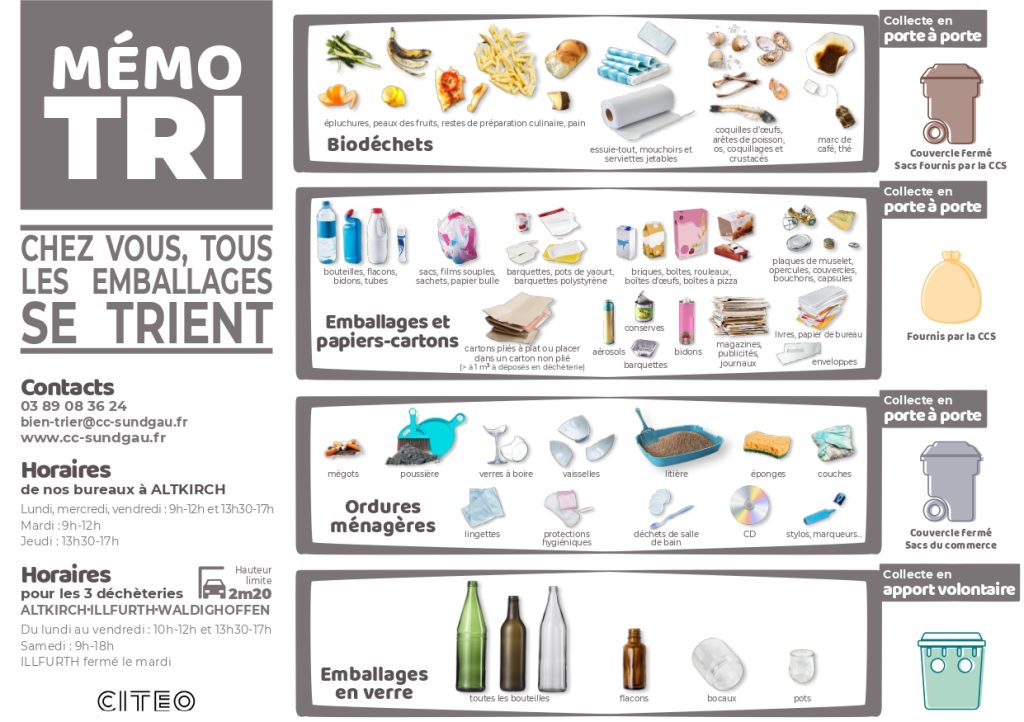 Consultez l’application “Guide du tri” de CITEO https://citeo.guidedutri.fr/ , téléchargeable sur mobile, et permettant de répondre à l’ensemble des questions portant sur les consignes de tri.
